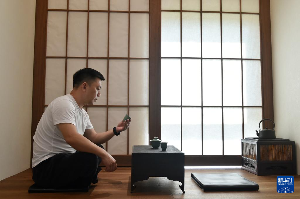 8月7日,“龙泉青瓷烧制技艺”代表性传承人王武在位于浙江省龙泉市的“初青·王武”工作室查看作品。