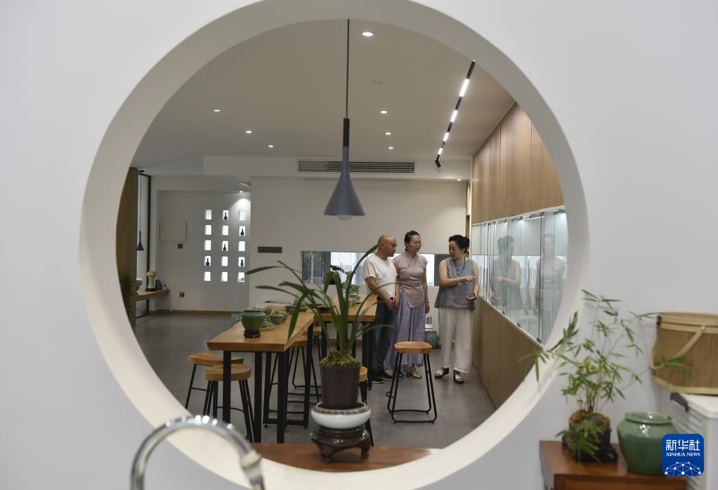 8月6日,在浙江省龙泉市小梅镇大窑村的一家青瓷工作室,青瓷艺人罗诗彬(左二)向来访者介绍自己的作品。