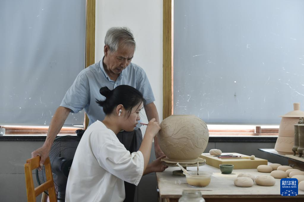 8月7日,在浙江省龙泉市的一家青瓷工作室,“龙泉青瓷烧制技艺”代表性传承人陈坛根(后)在车间指导工人刻花。