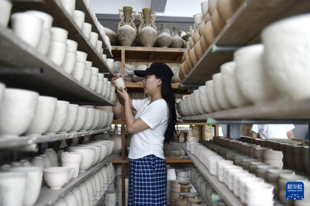 8月6日,在浙江省龙泉市一家青瓷工作室,青瓷艺人陈果检查素坯质量。