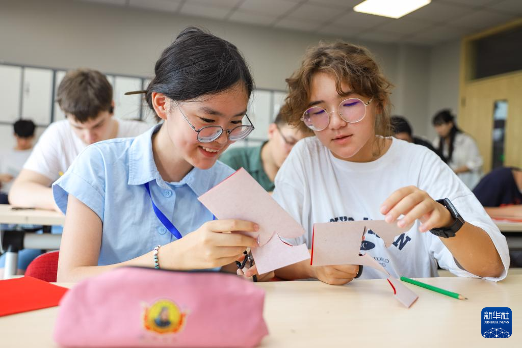 8月12日,在山东省青岛恒星科技学院,中俄学生交流剪纸创作。