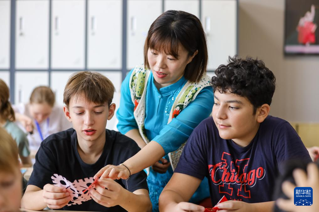 8月12日,在山东省青岛恒星科技学院,老师指导俄罗斯中学生创作剪纸作品。