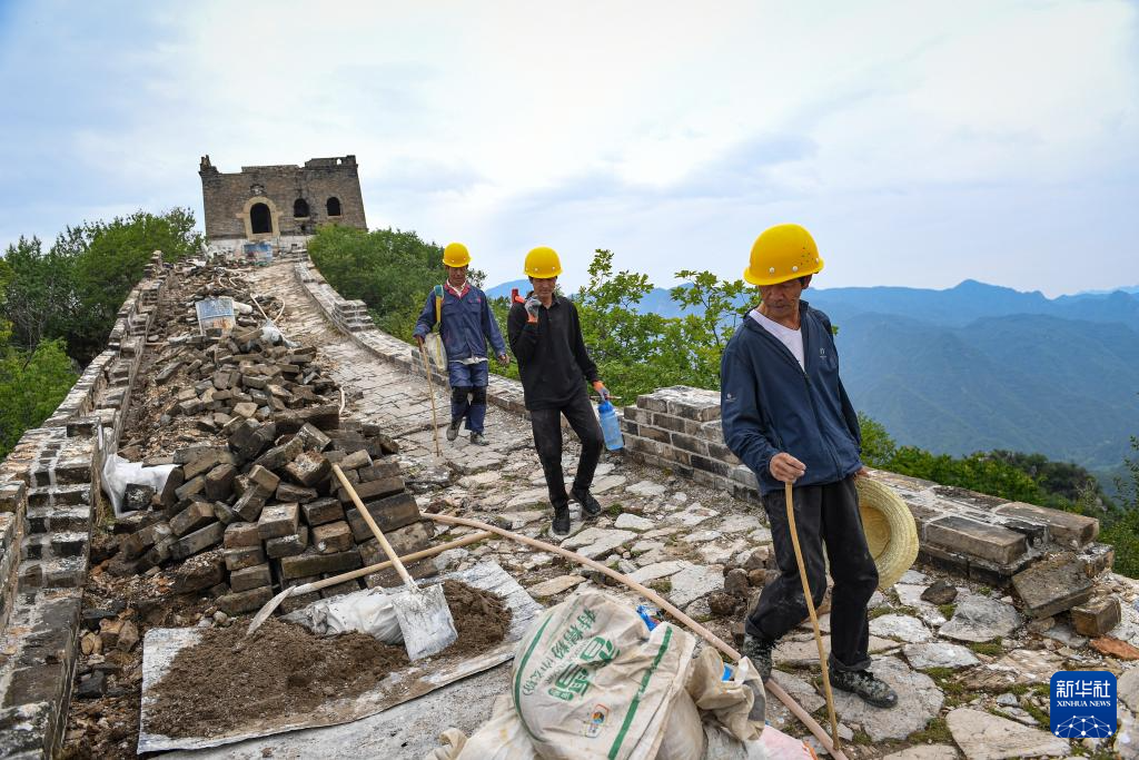 工人们走在箭扣长城122号敌台东侧墙体修缮施工现场(7月2日摄)。