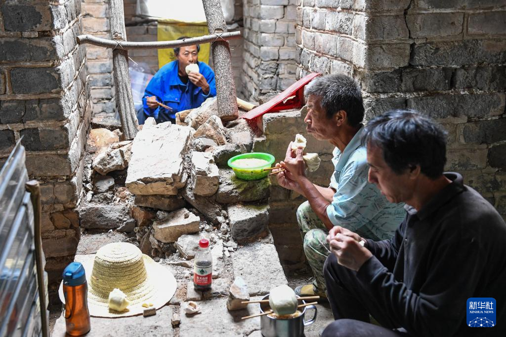 在箭扣长城122号敌台东侧墙体修缮施工现场,工人们结束上午的工作,准备离开去吃午饭(7月2日摄)。