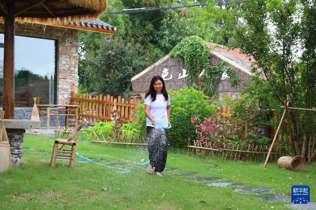 8月27日,在江苏省淮安市洪泽区老子山镇龟山村一家民宿,村民在给草坪浇水。今年以来,该村打造宜居宜业和美乡村,丰富旅游业态。