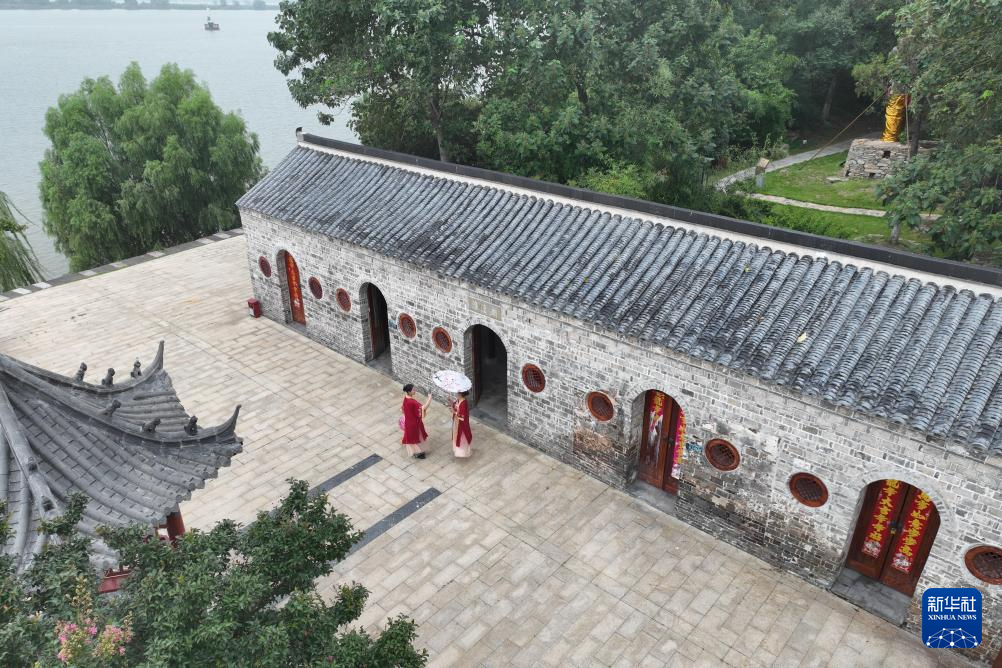 8月27日,游客身着传统服饰在江苏省淮安市洪泽区老子山镇龟山村游玩(无人机照片)。