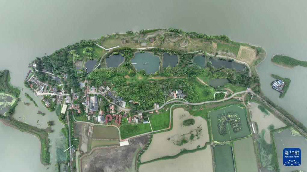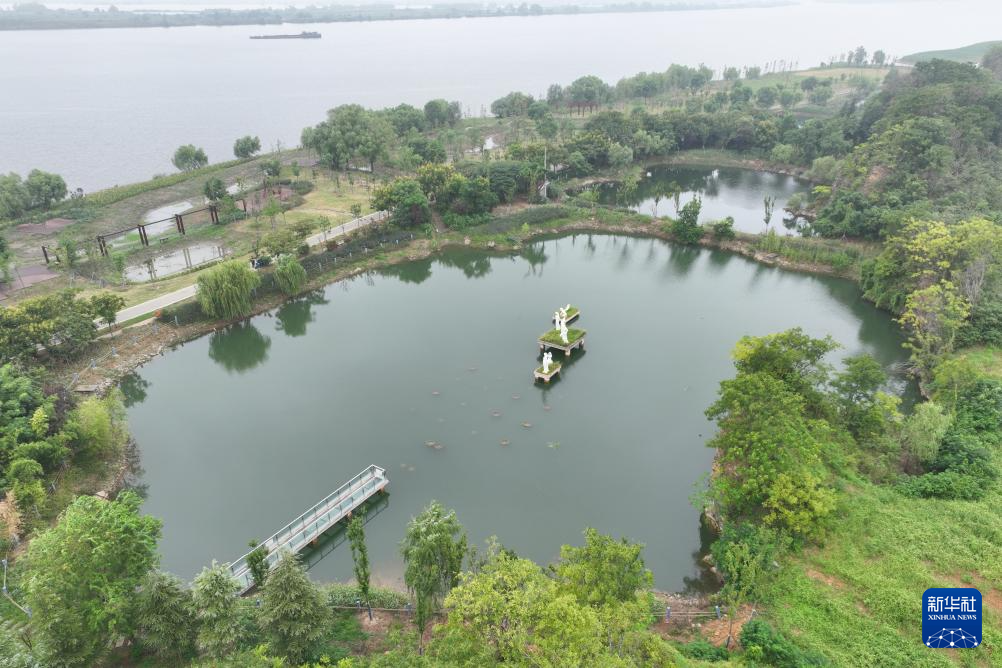 这是8月27日拍摄的江苏省淮安市洪泽区老子山镇龟山村“七仙瑶池”。2023年龟山村启动矿坑生态修复工程,村容村貌焕然一新(无人机照片)。