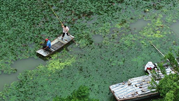 8月27日,村民在江苏省淮安市洪泽区老子山镇龟山村采摘菱角(无人机照片)。