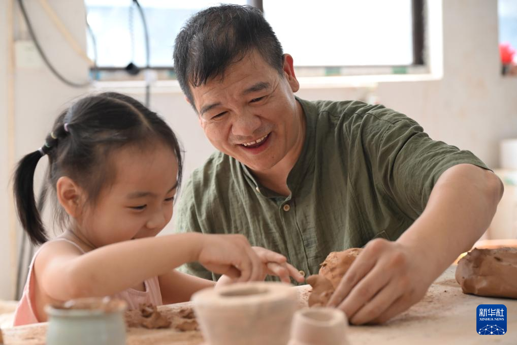 在善窑厂车间里,李善明(右)和女儿一起玩瓷泥(8月28日摄)。