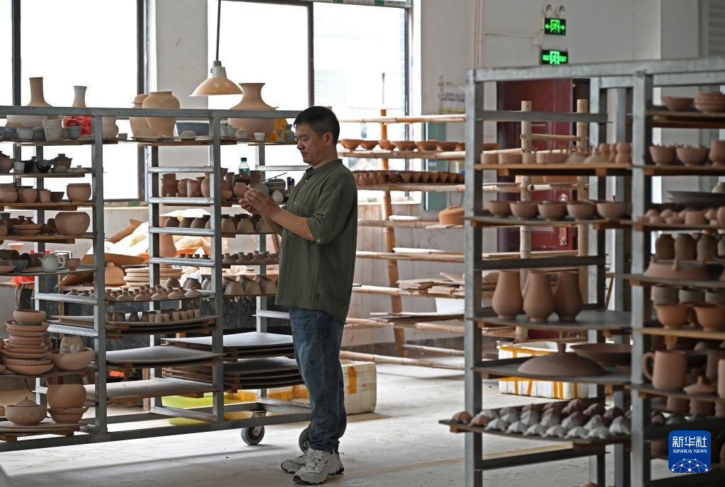 在位于江西省景德镇市善窑厂的车间里,李善明在查看产品(8月28日摄)。