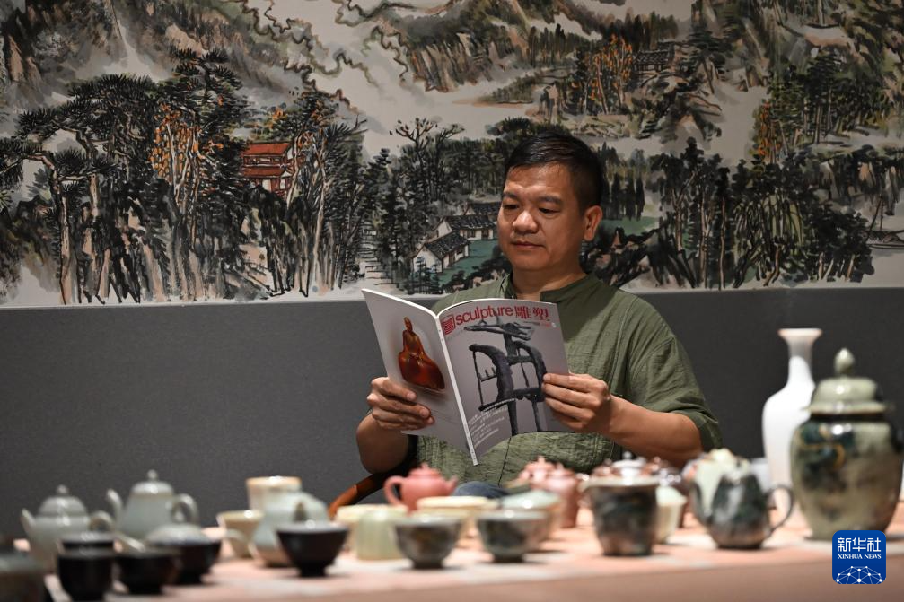 在善窑厂的工作室里,李善明在翻阅陶瓷相关书籍(8月28日摄)。