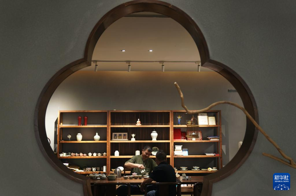 在位于江西省景德镇市善窑厂展厅里,李善明(左)在使用自制的汝瓷茶器与朋友喝茶(8月28日摄)。