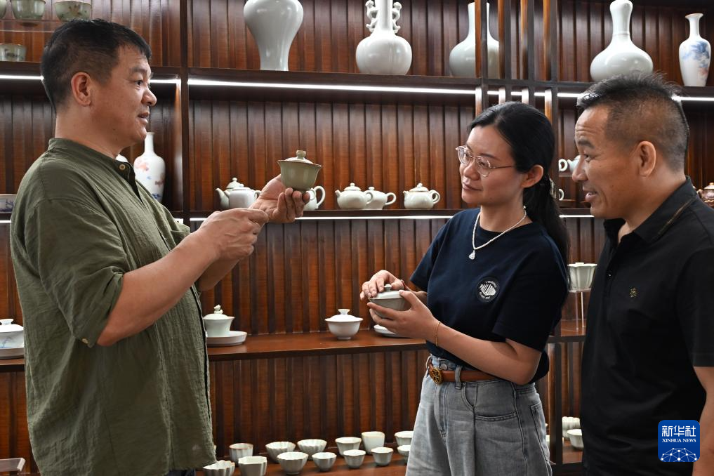 在位于江西省景德镇市善窑厂展厅里,李善明在欣赏一件汝瓷作品(8月28日摄)。