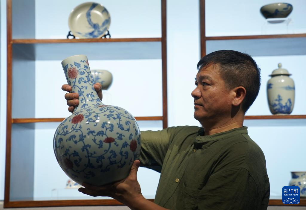 在位于江西省景德镇市善窑厂展厅里,李善明在欣赏一件天青汝釉瓷瓶(8月28日摄)。