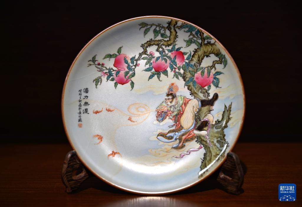 这是李善明烧制的汝瓷作品《西游记系列瓷盘》(8月28日摄)。