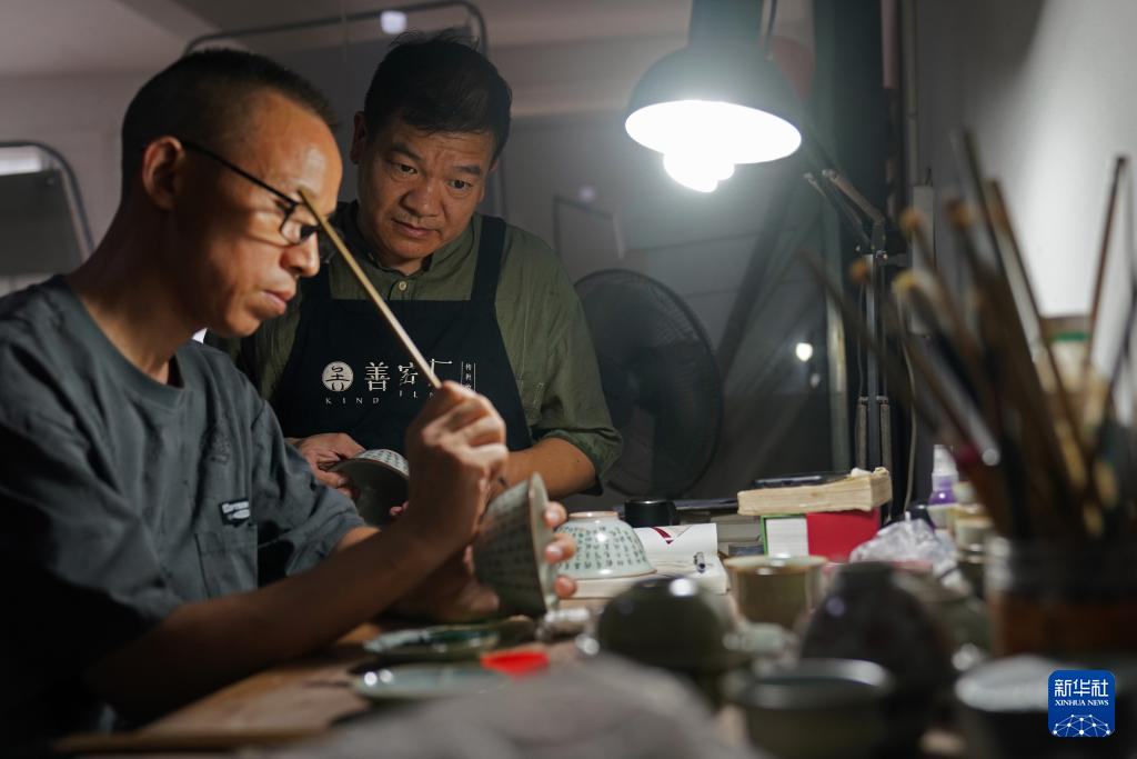 在位于江西省景德镇市善窑厂的车间里,李善明(右)在与画工交流(8月28日摄)。