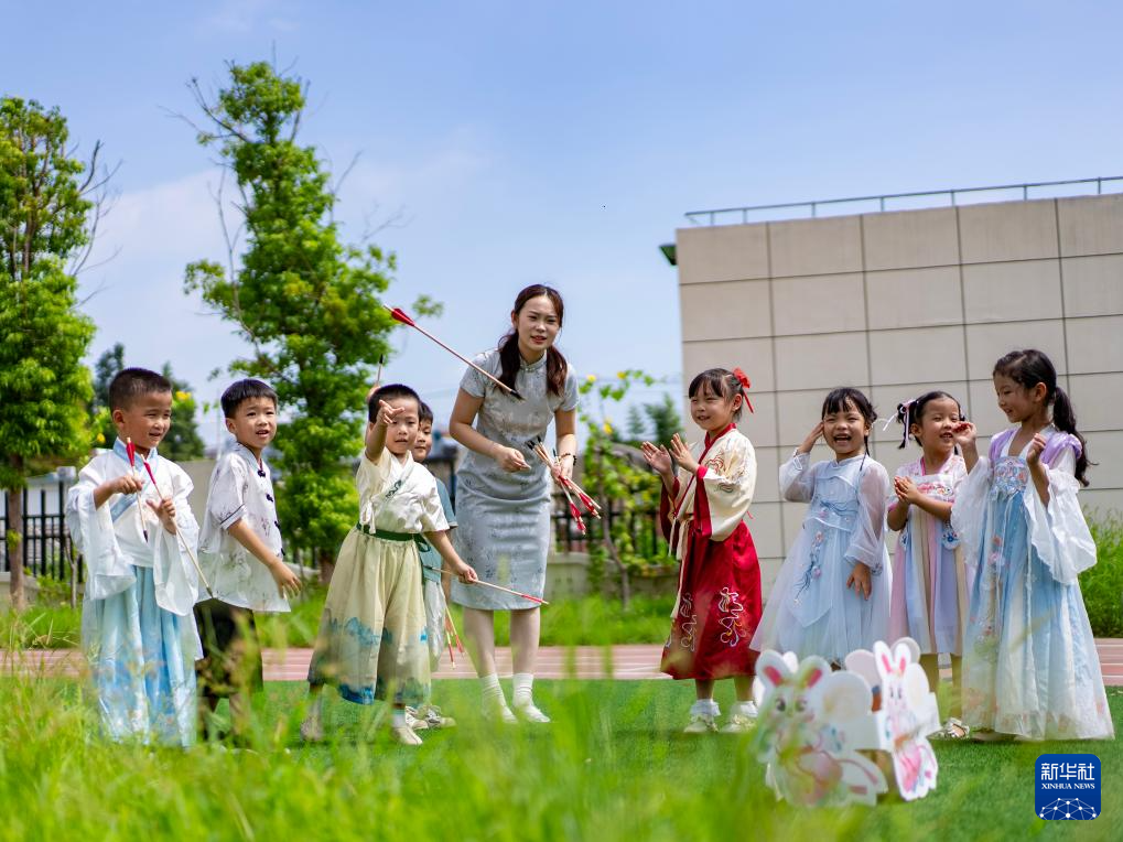 9月8日,在江苏省兴化市文林幼儿园,小朋友们进行投壶比赛。