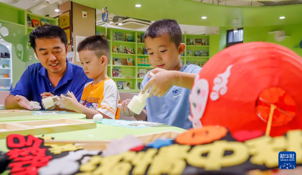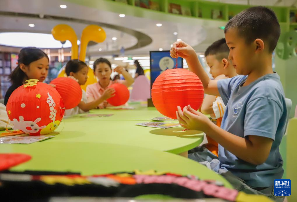 9月8日,在河北省遵化市新华书店举行的儿童迎中秋主题活动中,工作人员和小朋友一起做灯笼。