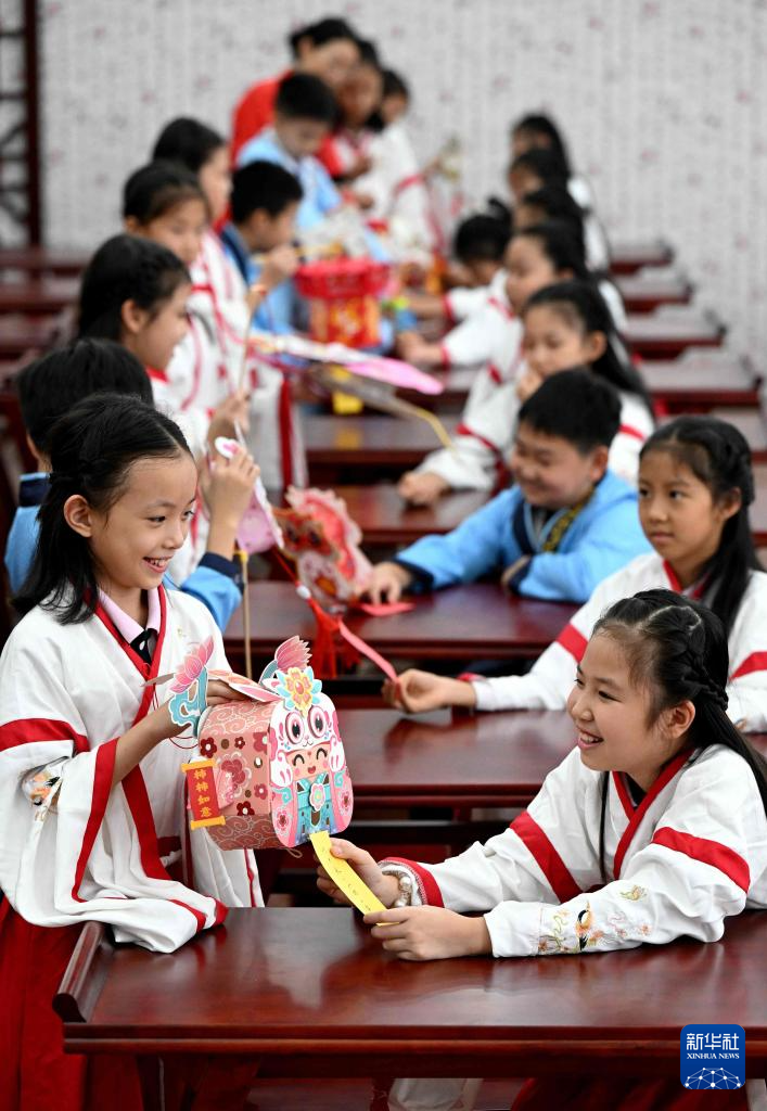 9月8日,在河北省石家庄市北郡小学迎中秋系列民俗主题活动中,学生们在猜灯谜。