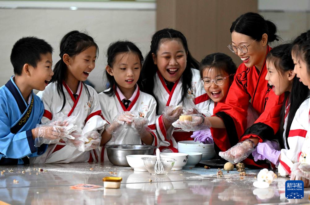 9月8日,在河北省石家庄市北郡小学,小朋友在老师的指导下制作月饼。