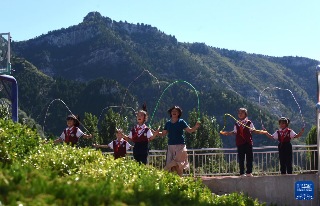 9月6日,在山东省淄博市沂源县南鲁山镇土门中心学校,朱庆凤(右三)课余和学生一起玩跳绳游戏。