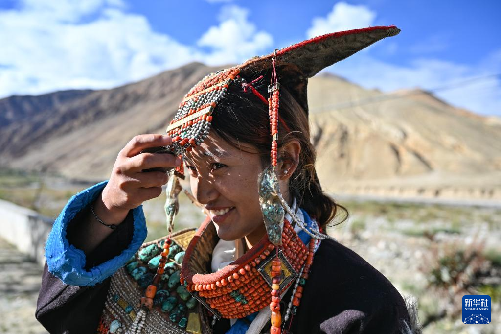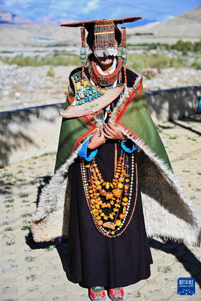 9月9日,在西藏阿里地区普兰县科迦村,村民展示普兰服饰。