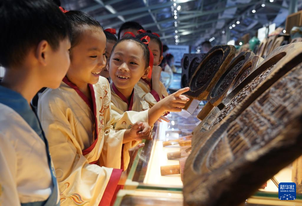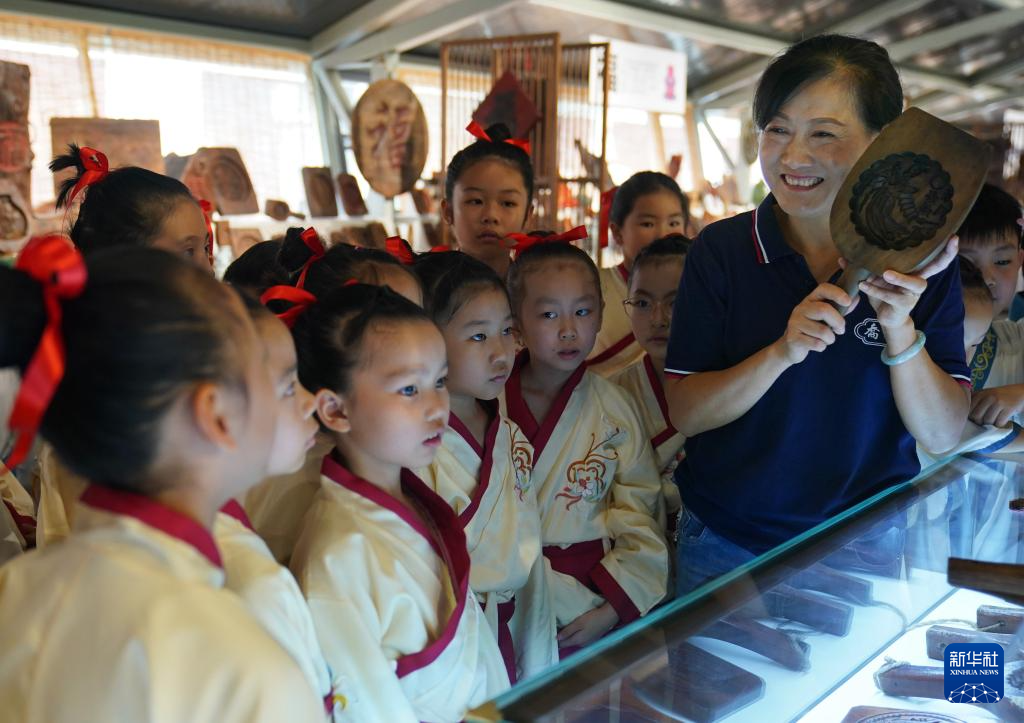 9月11日,孩子们在参观传统手工糕饼模具。