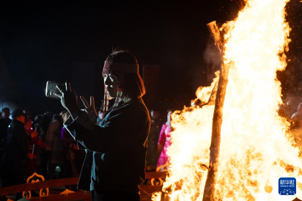 9月12日,在新生鄂伦春族乡新生村,游客身着鄂伦春族服饰在篝火前自拍。