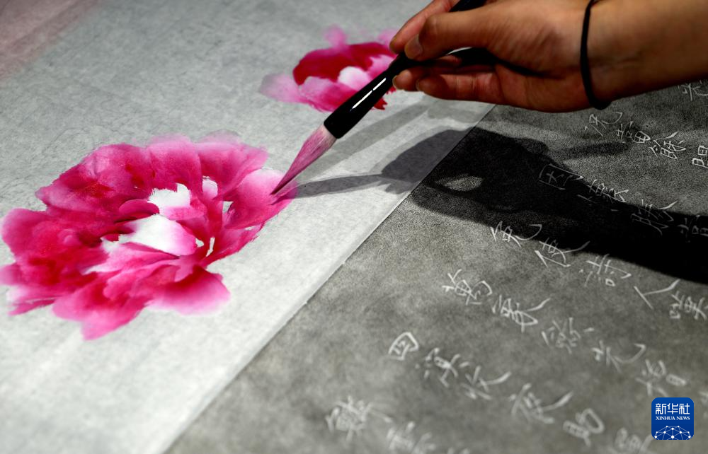 在洛阳华夏金石文化博物馆,钱夏玉在拓印完成的金石拓片上补绘牡丹画(9月11日摄)。