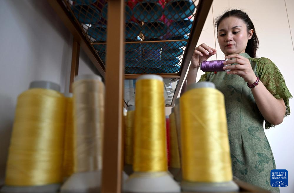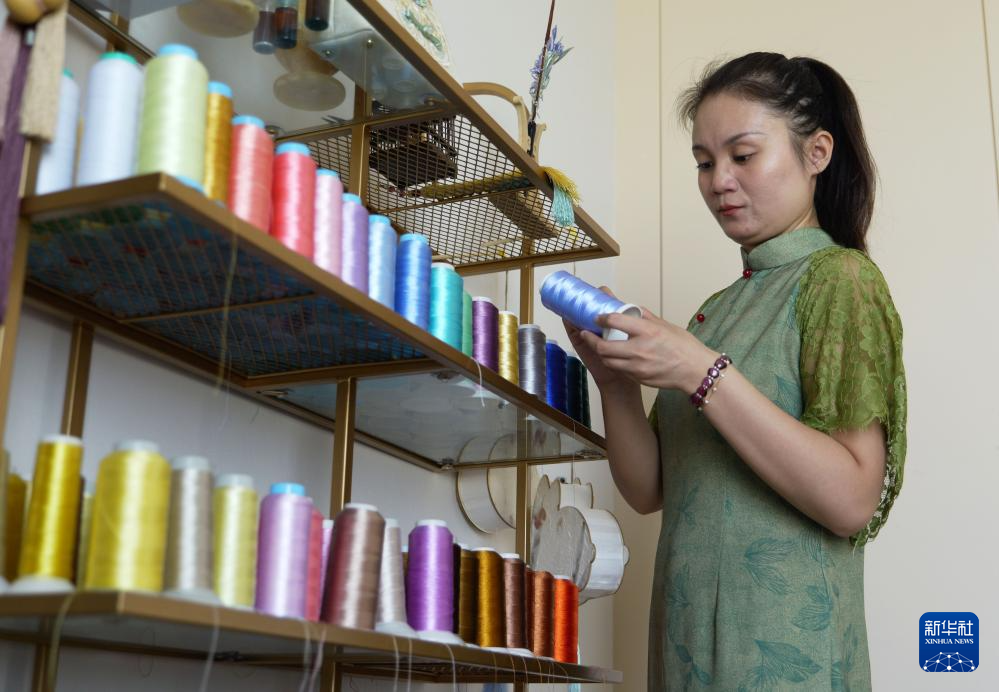 楚蒙丹在位于洛阳市的非遗体验馆里挑选丝线进行配色(9月12日摄)。
