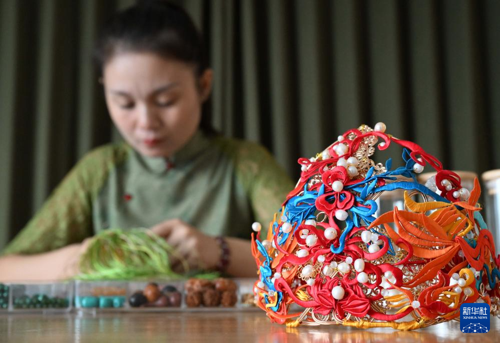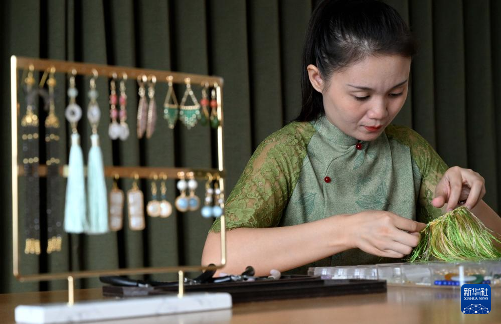 楚蒙丹在位于洛阳市的非遗体验馆里制作辑珠饰品(9月12日摄)。