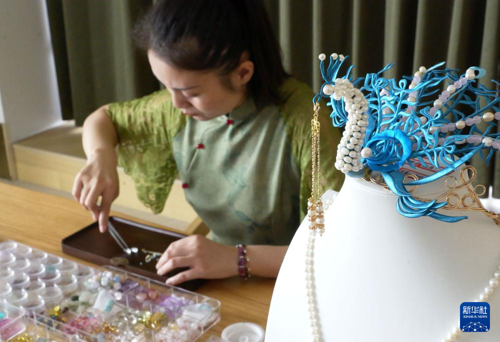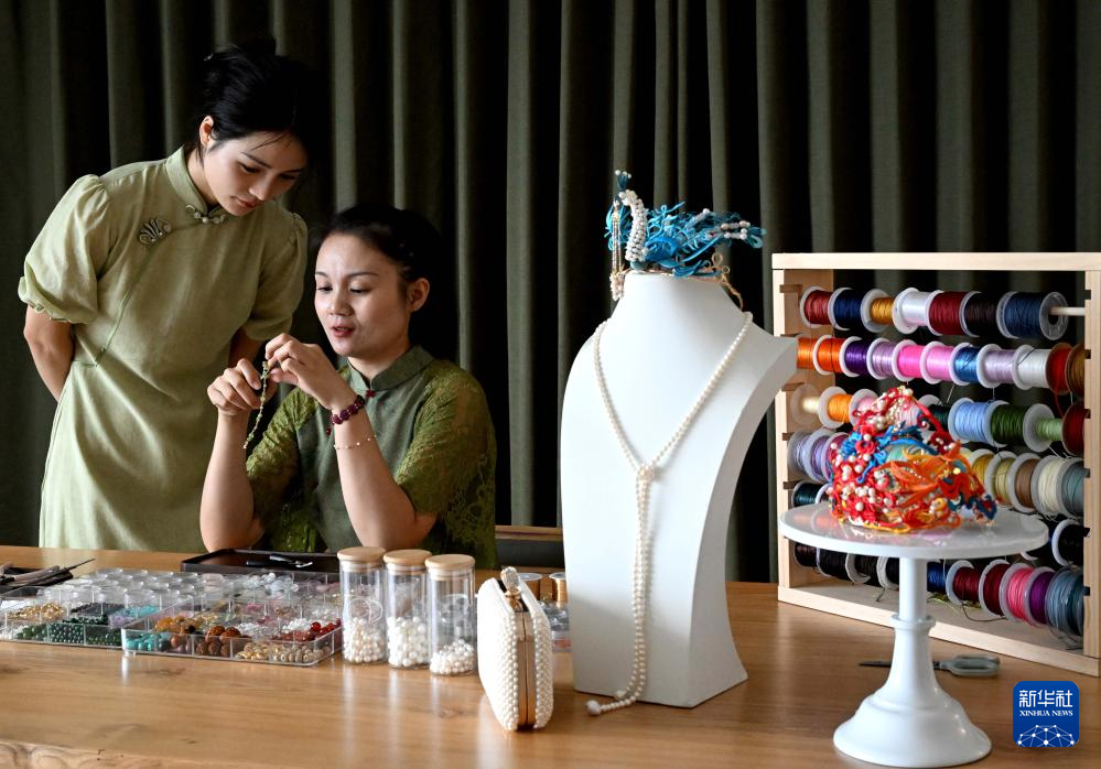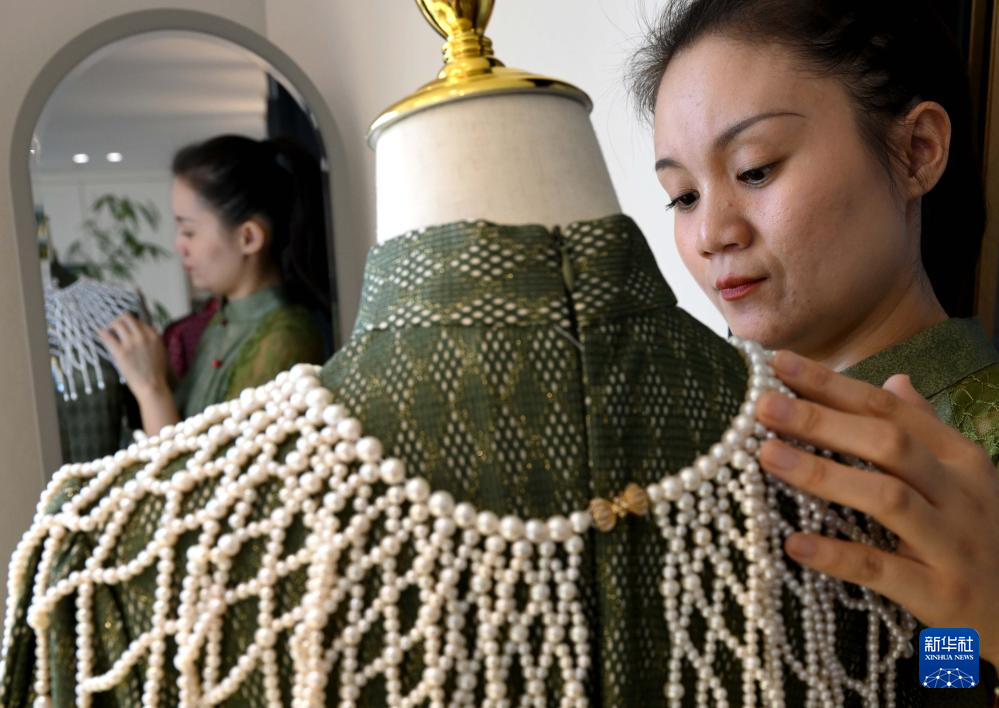 楚蒙丹在位于洛阳市的非遗体验馆里搭配珍珠辑珠胸针(9月12日摄)。