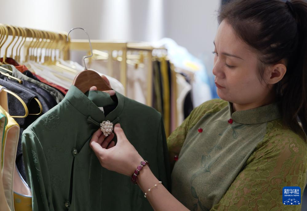 楚蒙丹在位于洛阳市的非遗体验馆里整理珍珠衫与服装的贴合度(9月12日摄)。