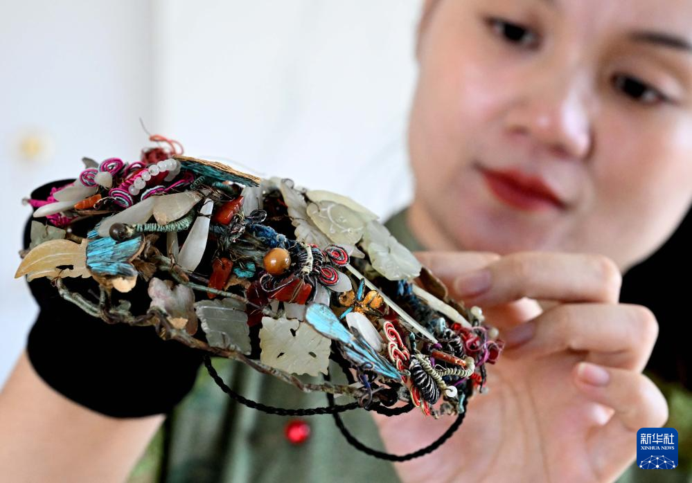 楚蒙丹在位于洛阳市的非遗体验馆里查看一件传统饰品,学习辑珠技艺的手法和配色(9月12日摄)。