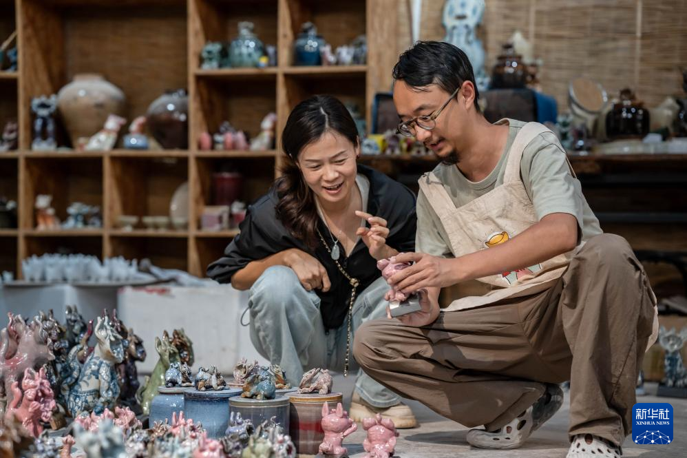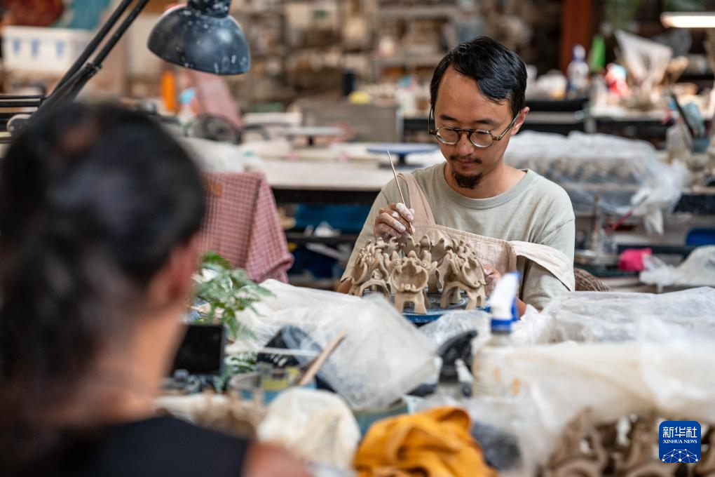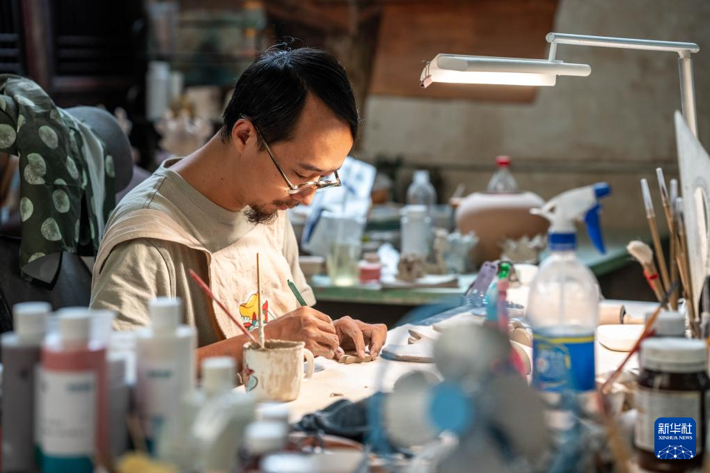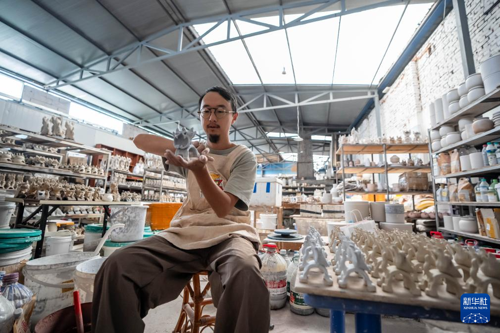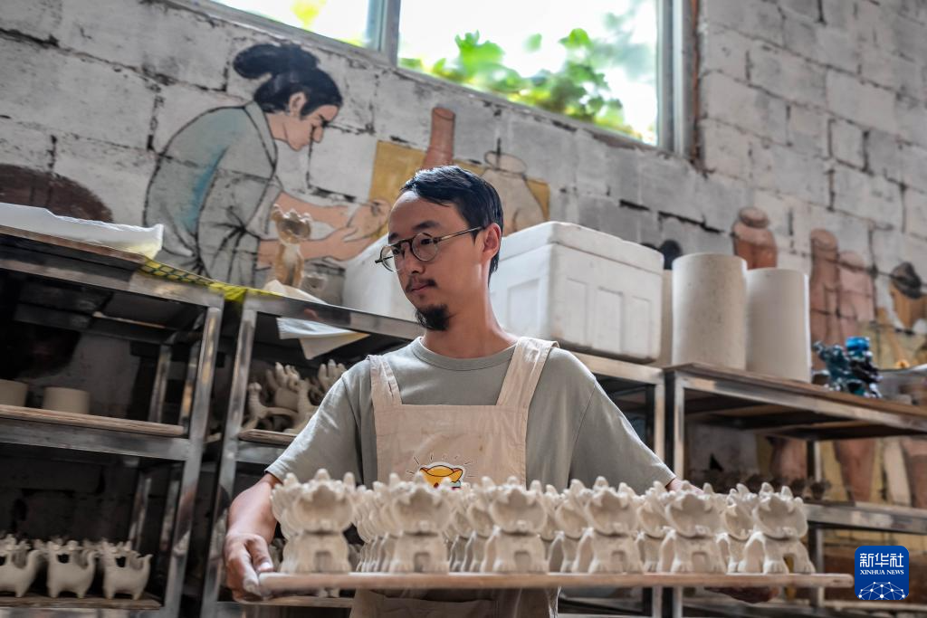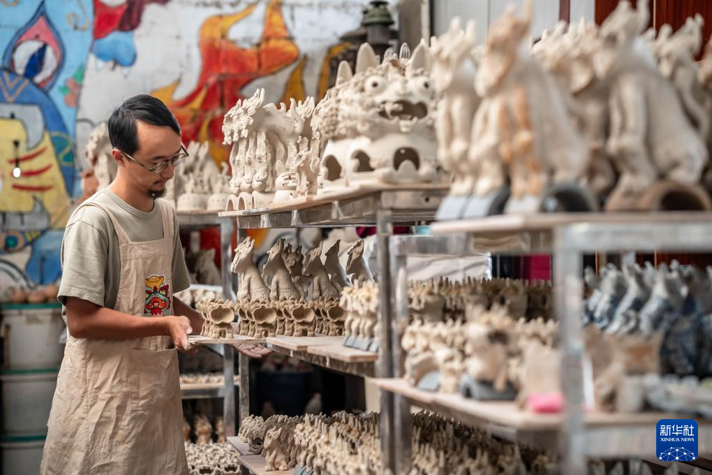 王子强在工作室内制作瓦猫(9月18日摄)。