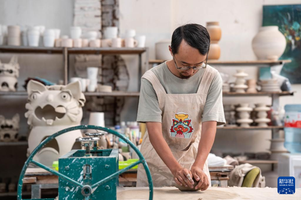 王子强在工作室内给瓦猫塑形(9月18日摄)。