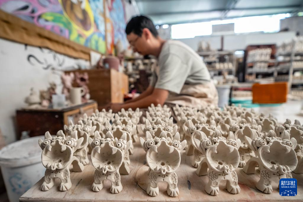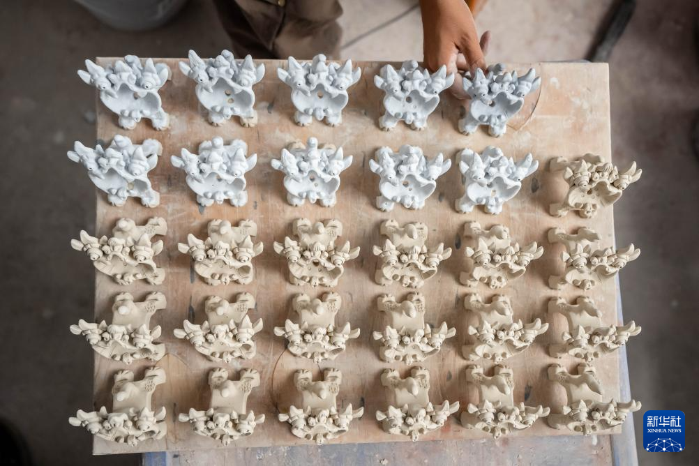 王子强在工作室晾晒塑形完成的瓦猫(9月18日摄)。