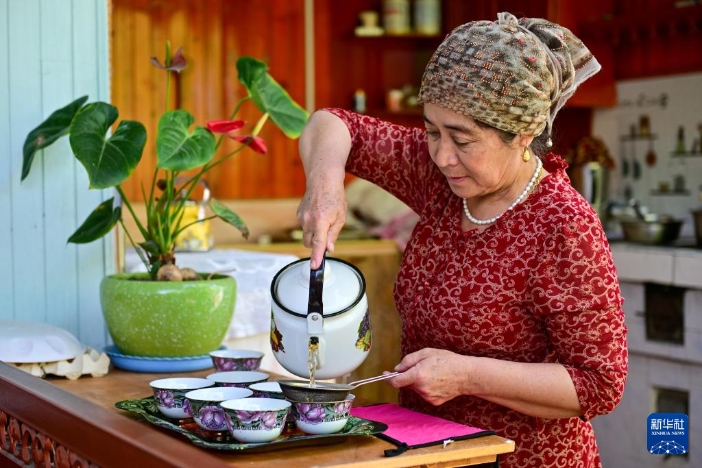 在新疆伊犁哈萨克自治州伊宁市喀赞其民俗旅游区,民宿老板马依兰·赛来洪为游客倒茶(5月10日摄)。新华社记者 丁磊 摄