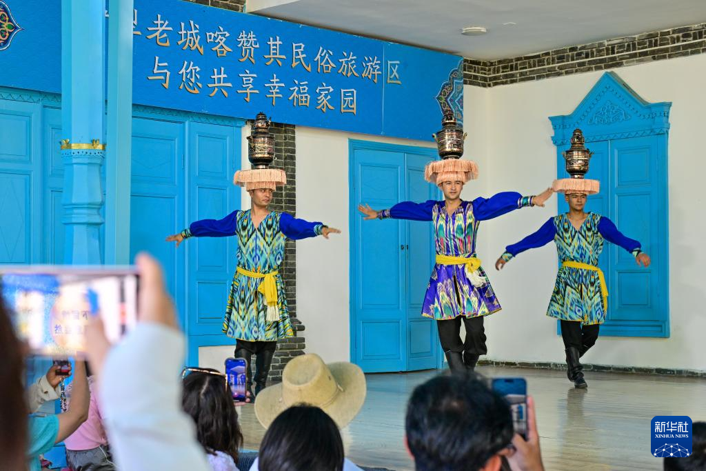 在新疆伊犁哈萨克自治州伊宁市喀赞其民俗旅游区,游客在锡伯车马店欣赏文艺表演(7月27日摄)。新华社记者 丁磊 摄