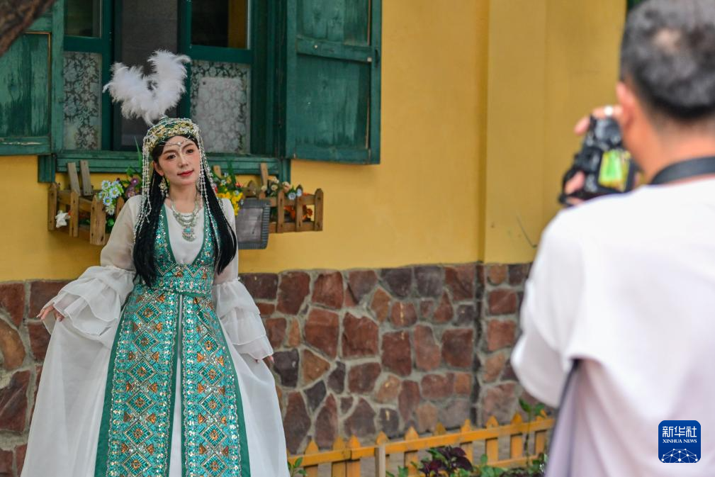 在新疆伊犁哈萨克自治州伊宁市六星街,游客体验旅拍项目(7月28日摄)。新华社记者 丁磊 摄