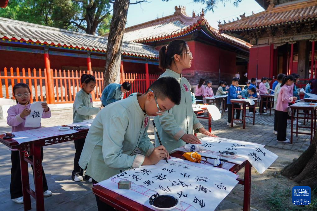 9月28日,在2024甲辰年公祭孔子大典上,学生在曲阜孔庙进行书法创作。
