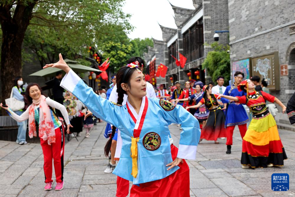 在京杭大运河畔的山东省枣庄市台儿庄古城,演职人员为游客巡游表演歌舞(10月7日摄)。