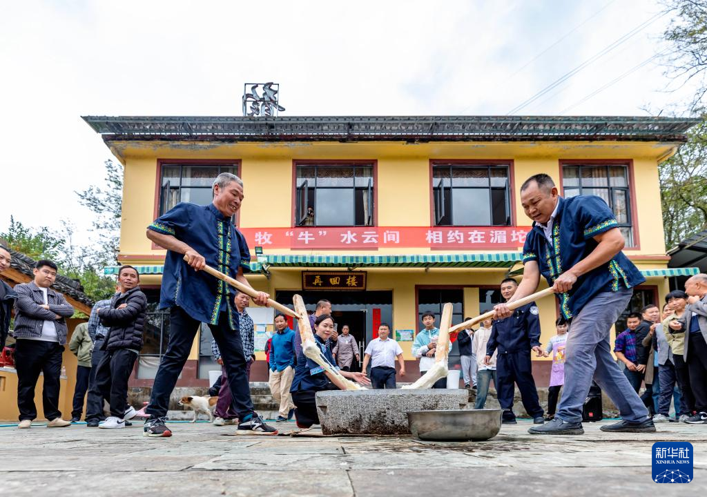 村民在贵州省铜仁市印江土家族苗族自治县缠溪镇湄坨村向旅客展示传统风情(10月2日摄)。