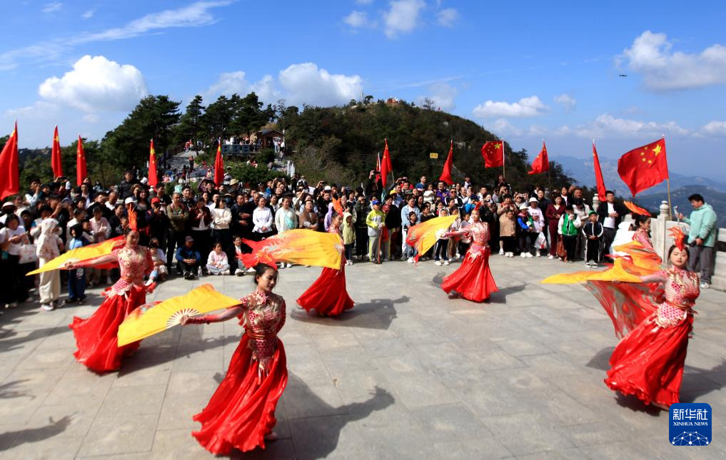 游客在山东省临沂市沂蒙山银座天蒙旅游区观看民俗舞蹈表演(10月1日摄)。