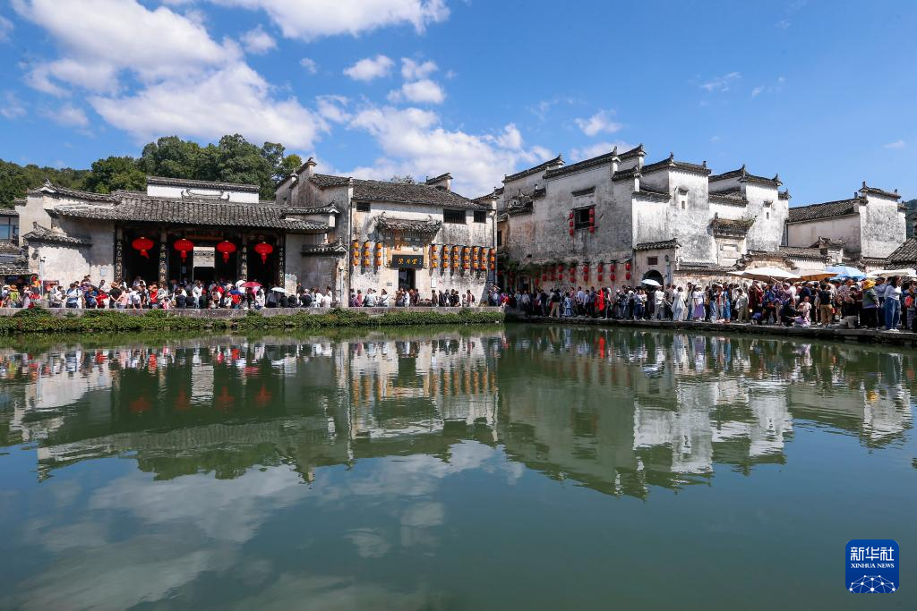 游客在世界文化遗产地安徽省黄山市黟县宏村游玩(10月3日摄)。