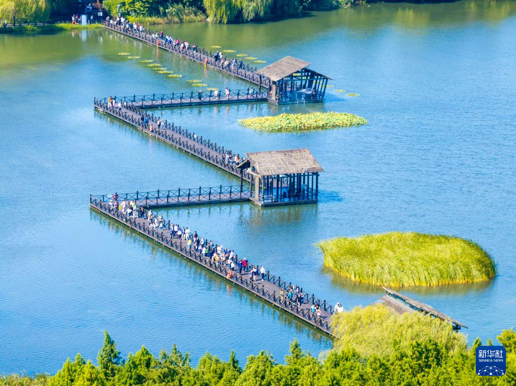 游客在江苏省泰州市姜堰区溱湖国家湿地公园游玩(10月2日摄,无人机照片)。