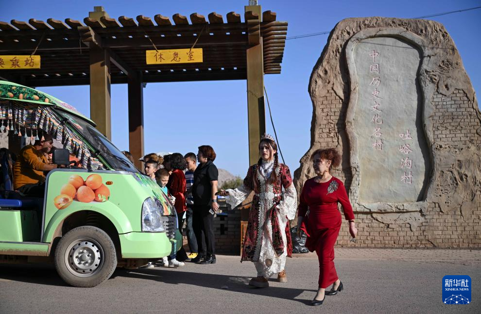 小朋友身着盛装走在新疆鄯善县吐峪沟乡吐峪沟村内(10月6日摄)。