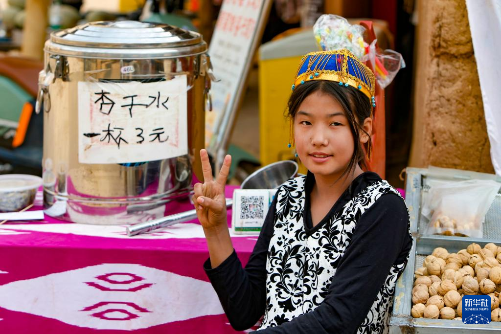 村民茹柯耶·艾合买提在吐峪沟景区内售卖杏干水(10月7日摄)。