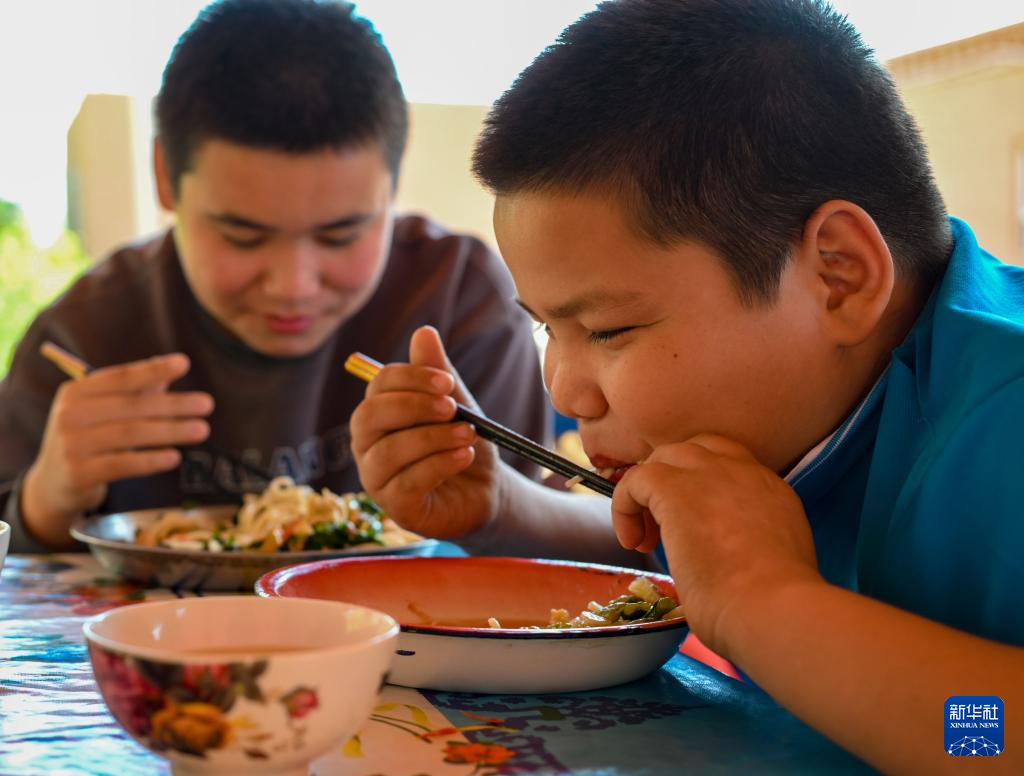 村民麦麦提萨力·吾斯曼(左)和弟弟比拉力·奥斯曼在家中吃午饭(10月8日摄)。