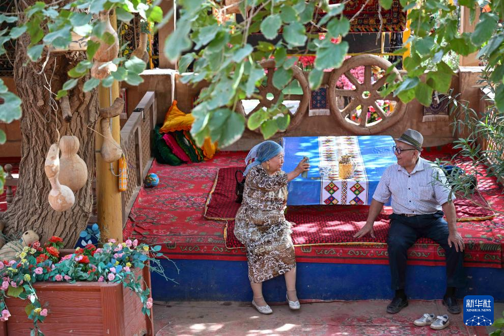 人们在新疆鄯善县吐峪沟乡吐峪沟村休息聊天(10月7日摄)。